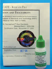納米級微球顆粒標(biāo)準(zhǔn)品(Particle-Size Standards)直徑大小高度均一,具有NBS NIST認(rèn)證,屬于Duke Scientific公司榮譽出品Nanosphere Size Standards™系列產(chǎn)品中的聚合體微球標(biāo)準(zhǔn)品(苯乙烯單體聚合而成)。
