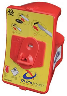 QLICKSMART手術刀片安全移除器是世界首創的單手移除手術刀片的工具,可以防止用手拿鑷子或者徒手取出刀片時所造成的意外傷害以及血源感染的風險。只需要將手術刀瓶送平推入移除器插入口,直到聽到“咔嗒” 一聲,刀片即自動完成移除,這個移除器可以容納100片。