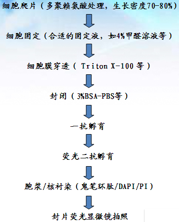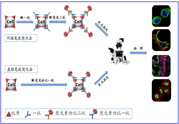 ?? 原理:免疫熒光就是利用抗原與抗體的特異性結合原理及特殊的熒光素標記技術,通過激光激發使熒光素發出熒光,在熒光顯微鏡下觀察熒光的變化從而對細胞內的抗原進行分析的技術。用免疫熒光顯示和檢查細胞或組織內抗原或半抗原物質等方法稱為免疫熒光細胞(或組織)技術。