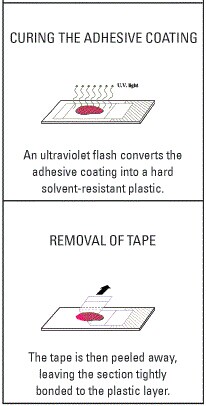 Glass slide with adhesive coating, when polymerized, bonds the still-frozen section from the tape to the slide. Avoid thawing the section. 4x coating slides for use with hard un-calcified bone) or fatty tissues.