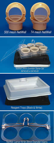 為確保實(shí)驗(yàn)的快速和高效,我們?yōu)楹Y籃配套了提手及籃架(carrier kit)和試劑盤(reagent tray)。篩籃可以直接放進(jìn)籃架,提到試劑盤進(jìn)行固定或者染色實(shí)驗(yàn)。試劑盤兩種顏色可供選擇:白色和黑色,白色試劑盤便于觀察顏色變化。黑色試劑盤便于清楚觀察切片位置。方便大家使用,我們提供以下套裝,套裝包含6個(gè)直徑24mmnetwell(或者12個(gè)直徑15mmnetwell);兩個(gè)試劑盤(一黑一白);提籃一套(carrier plate handle)。