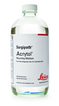 Surgipath®,Acrytol®,一款快干型封片劑(病理快干封片膠),顧名思義,這款封片劑的溶質成分是丙烯酸樹脂;溶劑是甲苯、二甲苯、以及二甲苯替代物;同時添加一種抗氧化劑(用來阻止染料的褪色和年輪紋的形成)。低粘度,封片均勻,不形成氣泡,需要蓋玻片,常用于病理實驗室中。
