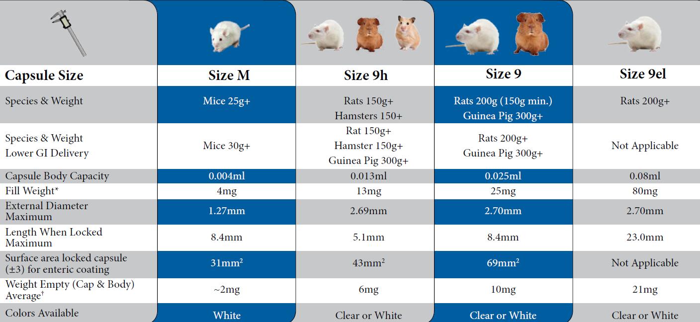 小動物專用膠囊根據使用對象的個體大小分為四個級別:9el號、9號、9H和M號。9號適用于大鼠(體重150g以上)和豚鼠;M號適用于體重大于30g的小鼠。另外,9號還適用于大鼠(200g-250g)的肛腸給藥(是不是也要考慮包衣問題?)。考慮到9el號膠囊太大,不適合腸溶,就不給出包衣的指導面積了。