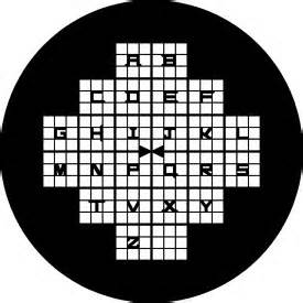 l 200目F2型坐標載網:粗的柵條分割出小的區域,每小區域內是細柵條組成的9個孔,每一區域對應一個字母編碼。