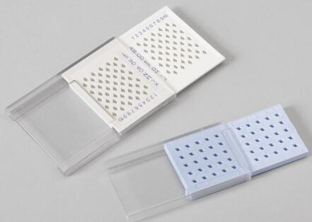 提供50孔和100孔兩種規格的樣本盒,用來存放3.05mmTEM載網。每個儲格間進行數字/字母組合編碼,便于精確定位檢索樣本。每個儲格設計為菱形,可以很好的防止拿取時手的抖動對樣品造成損害,孔深可以很好的固定以防運輸或者顛倒時載網滑落。